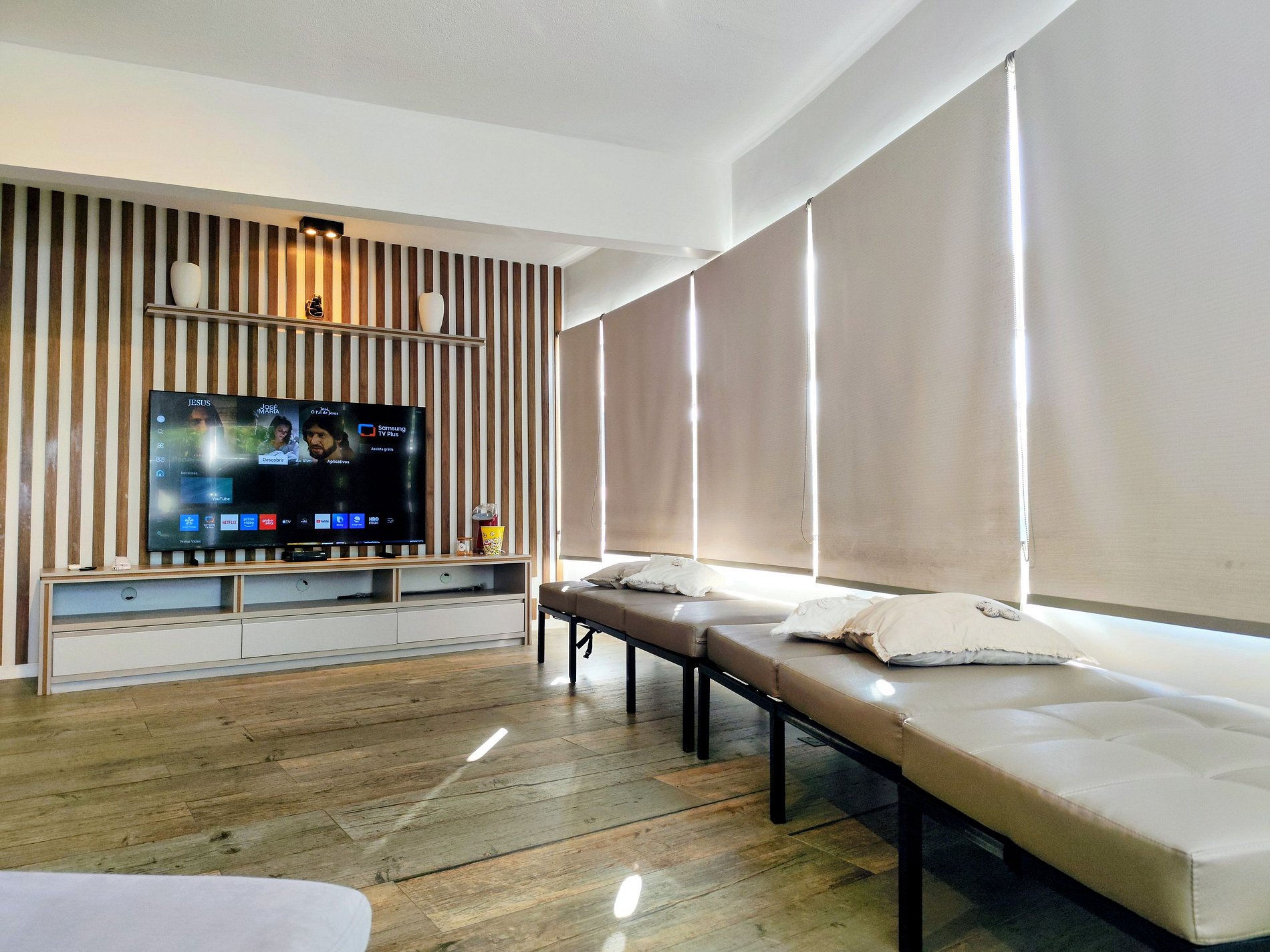A sala com Living ampliado, persianas blackout, sofá cama, TV Smart, em um amplo Living conjugado com a cozinha c/ uma Ilha Gourmet em formato de Barco e ampla e Panorâmica Vista do Mar da Praia do Tombo.
