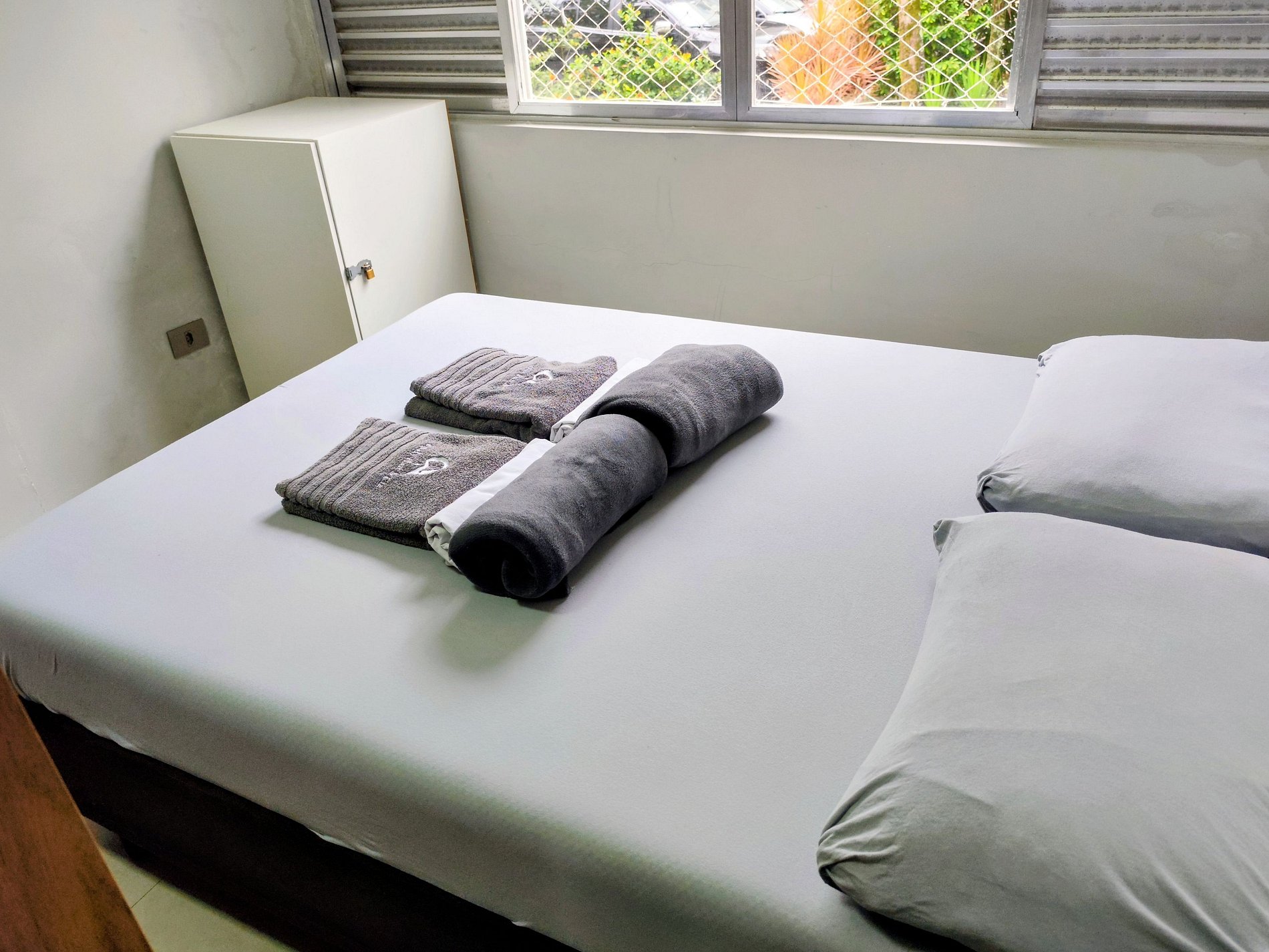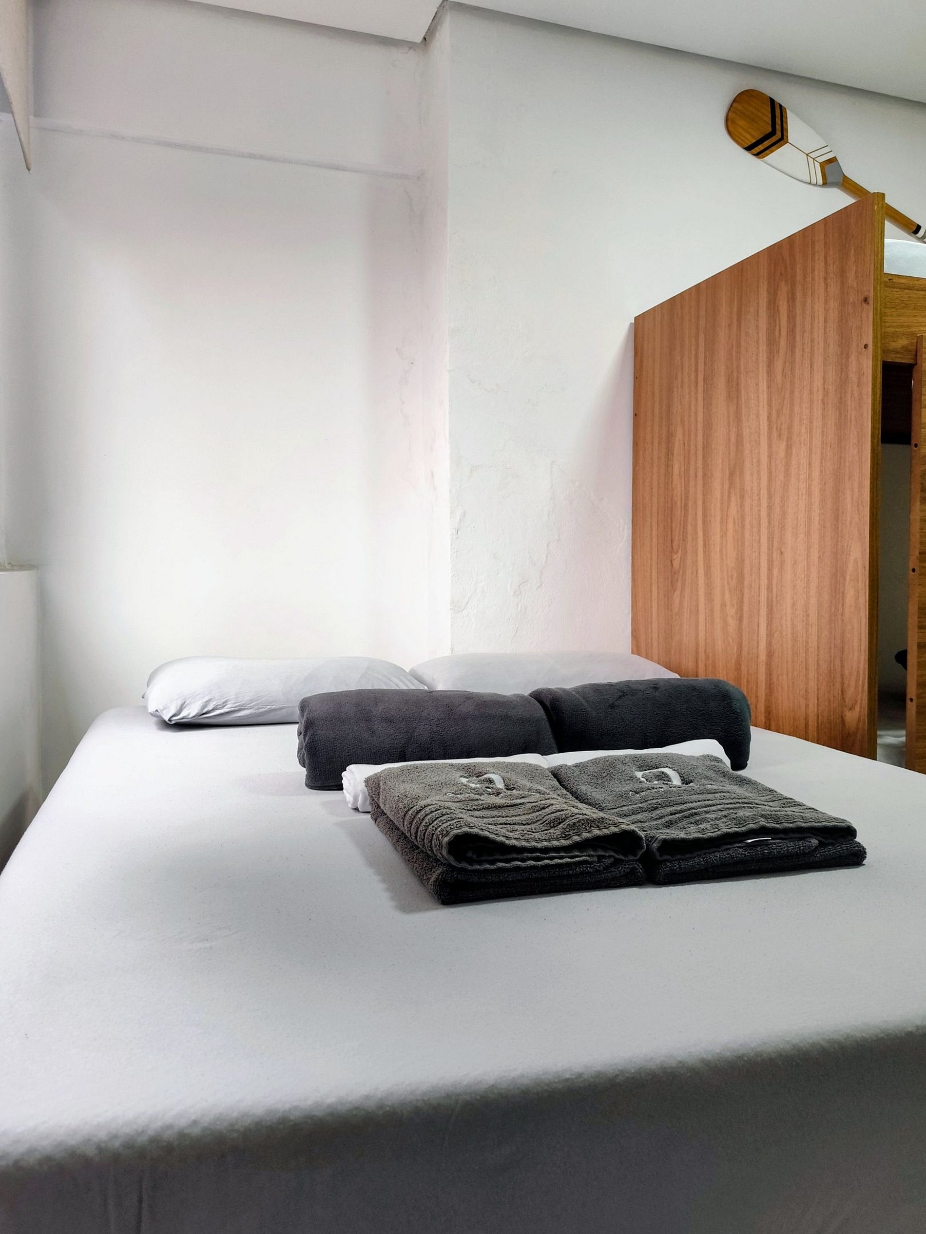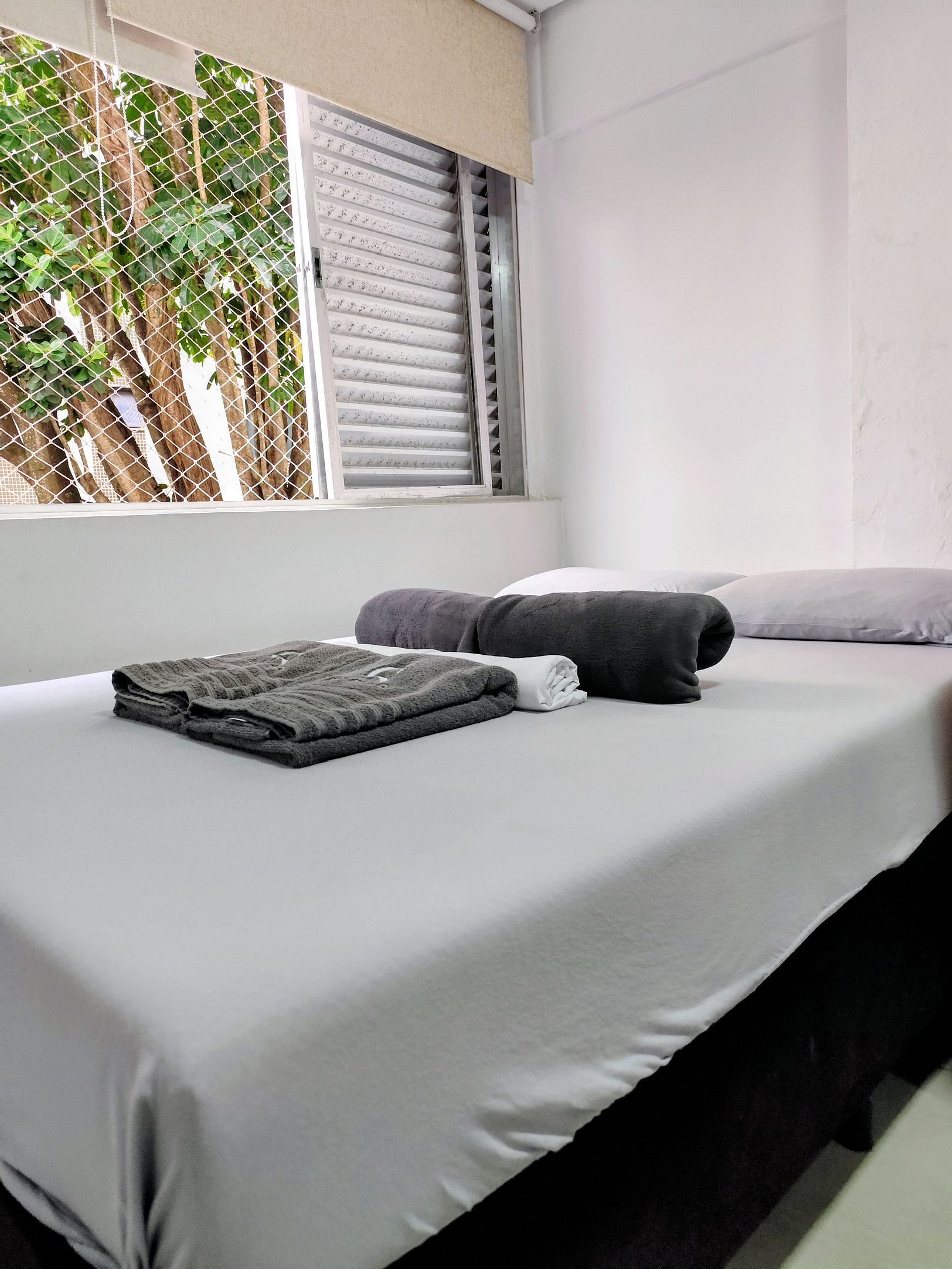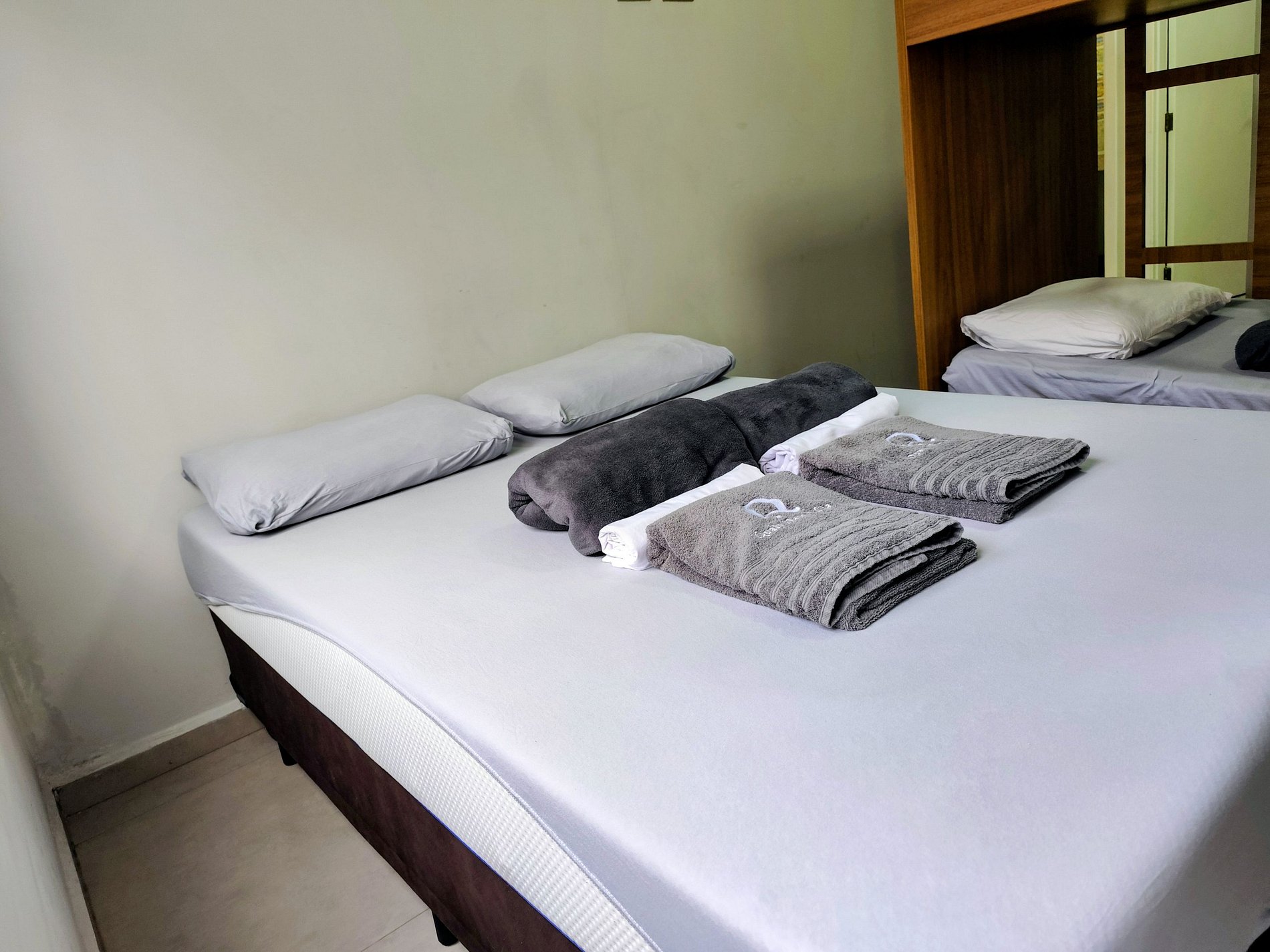 Com roupas de cama banho