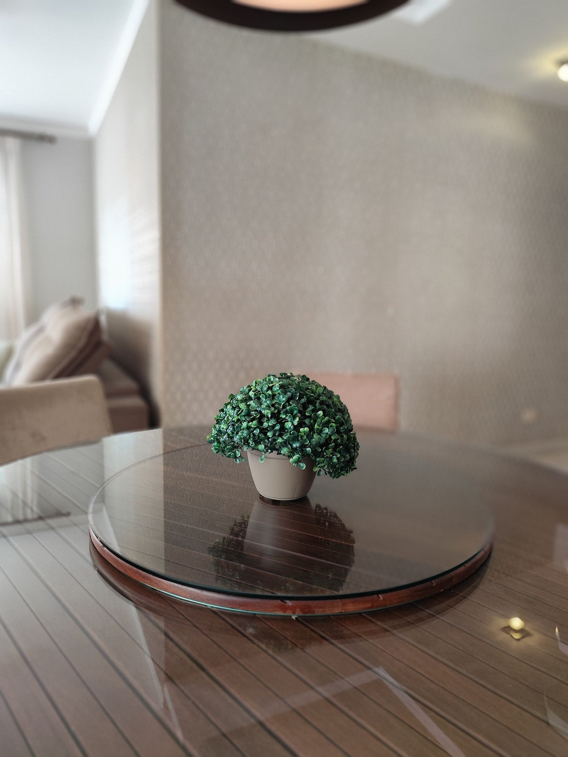 Sala de estar e jantar integradas com TV Smart e sofá retrátil.