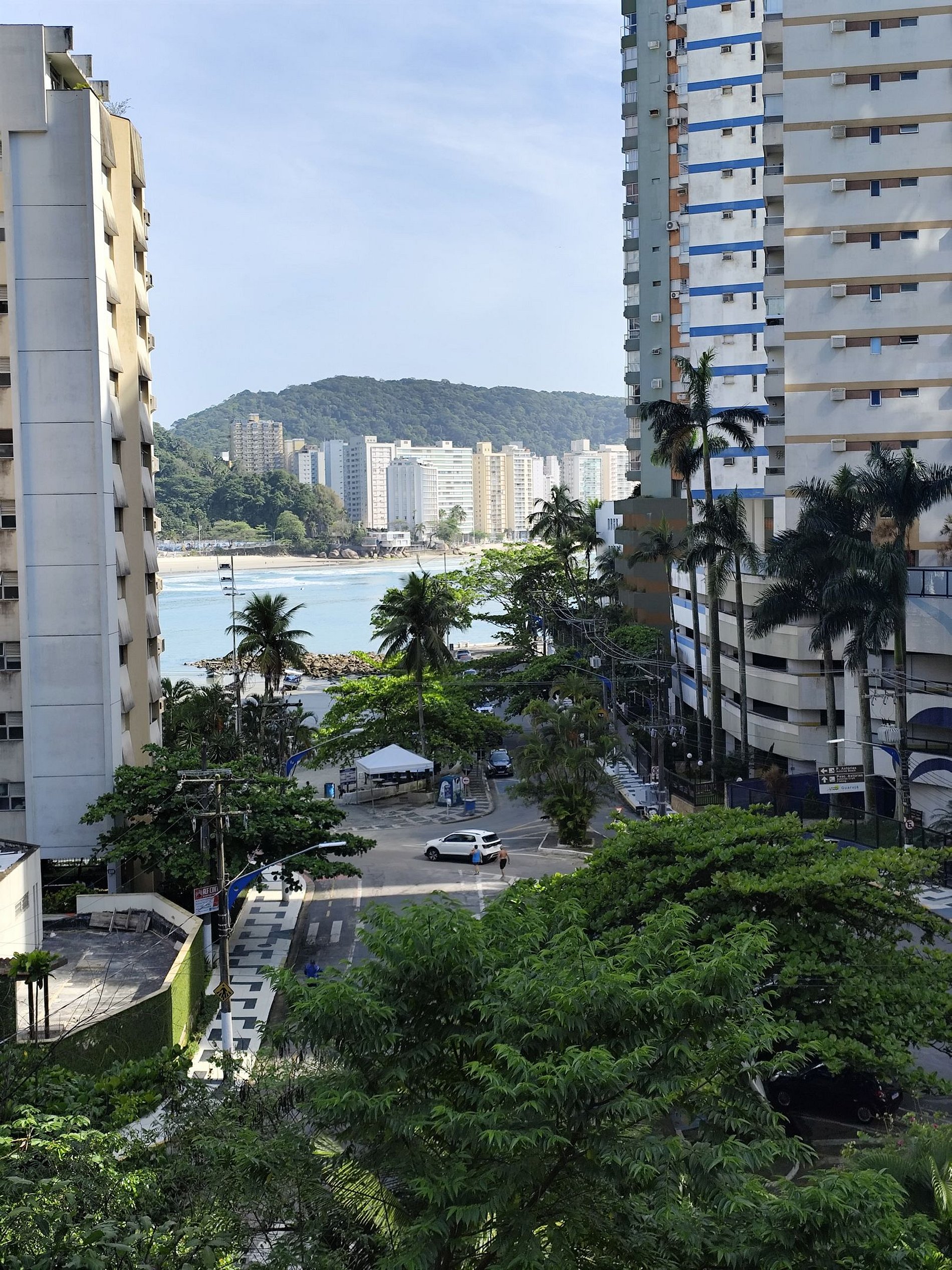 O apartamento fica em frente à praia do Tombo com acesso direto pelo portão de entrada do condomínio.